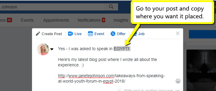 Paste your copied font into the post itself on Facebook … or Twitter or inside ads manager. (This is linking to my last blog post)
