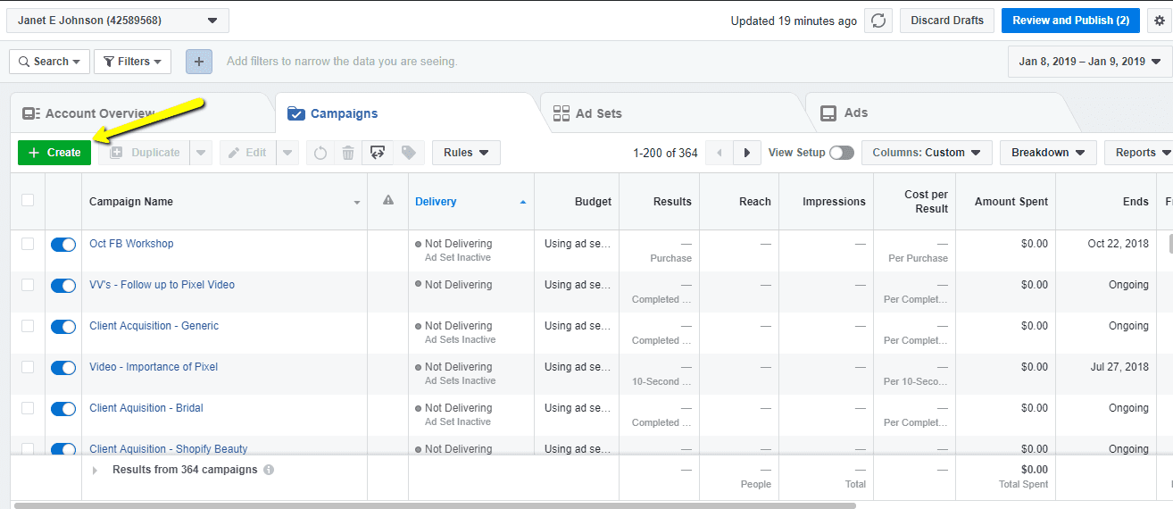 STEP 1: Go into ads manager and click the green button: Create.