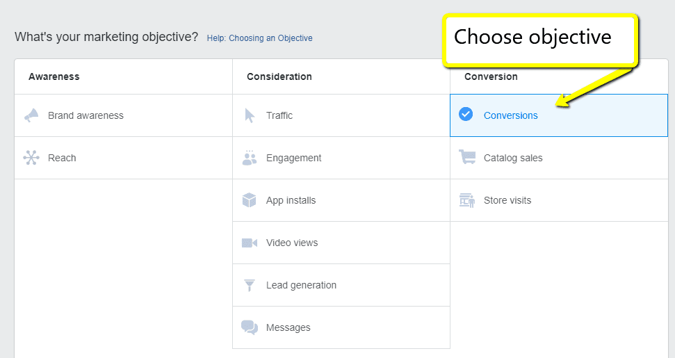 In this example, I am choosing Conversions because it is a webinar lead generation ad. But, this will work for any type of objective you decide to choose.
