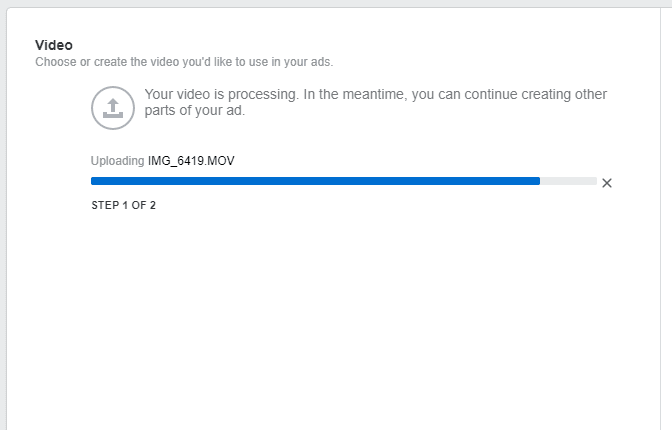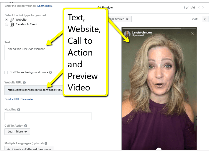I prefer video. You can also use an image. For video (which I prefer), this should be a vertical video. I create mine right on my iPhone, save to dropbox and upload into ads manager. For graphics, the sizing is vertical – 1080px by 1920px. Choose image or video.
