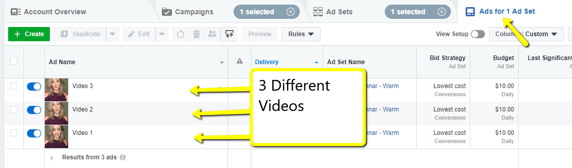 (Optional): Test additional Creative Duplicate Campaign and Ad Set. Go into Ad. Clear video or graphic and replace with different one. Then name and save.